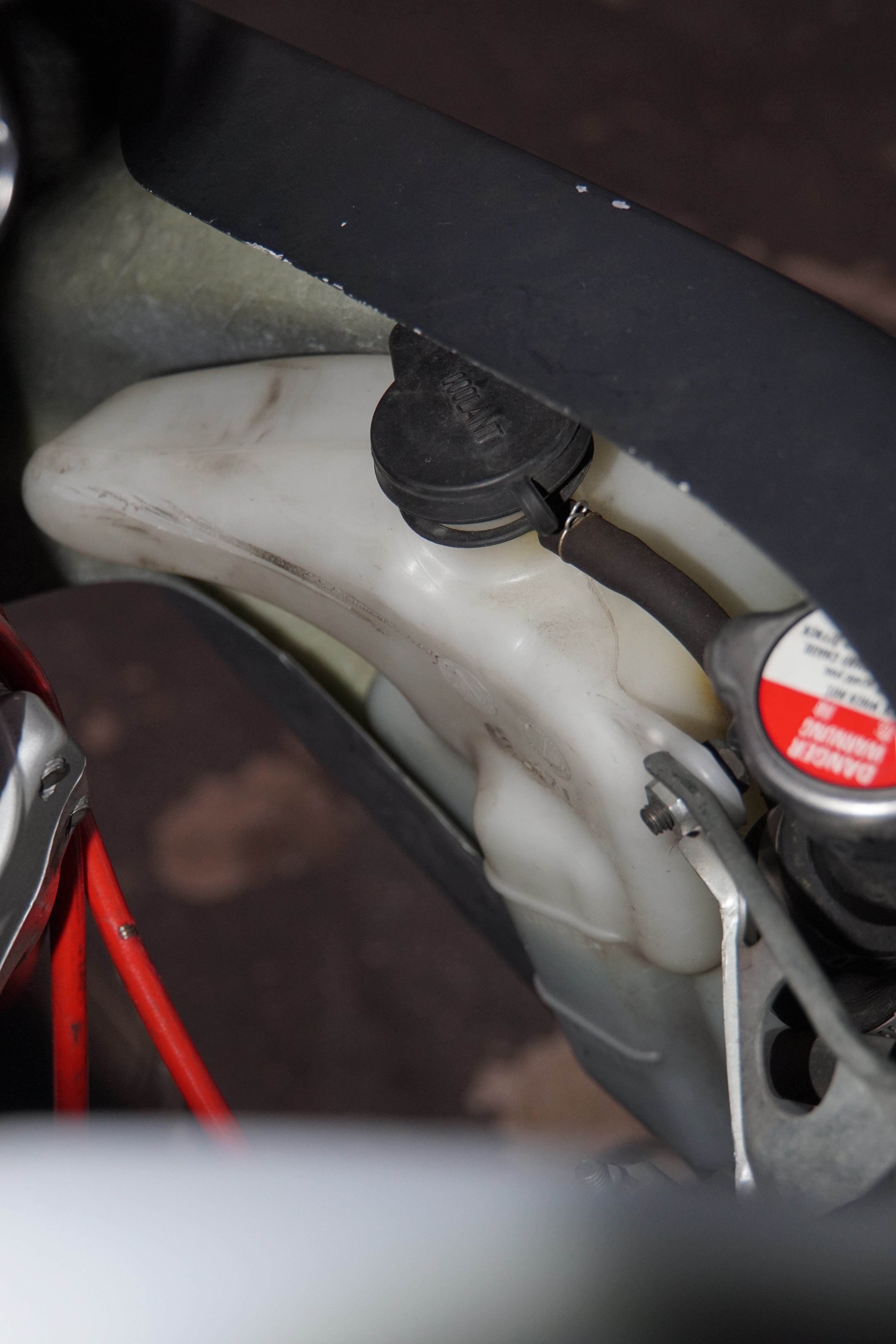 12. Kühlflüssigkeit ablassen & durch Wasser ersetzen - Frostschutzmittel ist auf der Strecke nicht erlaubt, da es im Fall eines Sturzes die Fahrbahn extrem rutschig macht. Also: Kühlkreislauf spülen und mit klarem Wasser füllen!